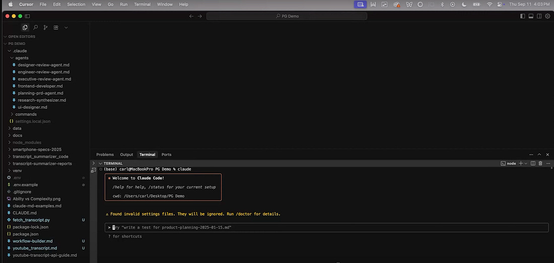 1. Why PMs Should be Using Claude CodeYou thought Claude was just a development tool. But it’s actually just the right way to interact with LLMs. There’s three key reasons: Reason 1 - Automatic File ContextIn traditional chat interfaces, you manually copy-paste files or drag them in one at a time. Claude Code automatically reads your entire folder structure. Ask “how many customer interviews have we done?” and it searches your project, finds the files, and analyzes them instantly. This is context engineering at its finest - giving the LLM the right context quickly without manual work. Reason 2 - The Token Visibility AdvantageClaude Code shows you exactly how many tokens each task uses. No other interface does this. When pricing is $1.50 per million tokens, you finally understand what that means. You see the cost of your requests in real-time. Reason 3 - Multi-Agent ParallelizationClaude Code can spin up multiple instances of itself running completely in parallel. Need to analyze three customer interviews? It creates three UXR agents that work simultaneously. A task that takes a week manually or a full day with regular LLMs? Claude Code finishes in an hour. So now that we’ve convinced you to use Claude Code… how? 2. The Basics of Claude Code2a. How to Use Claude CodeYou may have heard that people use Claude Code through the terminal. And that’s true. You set it up using a terminal command like: We demo what it’s like to use inside a terminal window. But our recommendation? Use Claude inside of Cursor: This gives you an entire IDE to work with. 2b. Engineer Claude Code’s ContextClaude Code is only as powerful as the context you give it. The #1 mistake AI PMs make is not having the right project structure. Carl’s project structure includes: