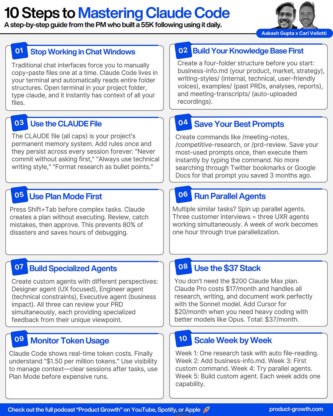 Unlike prompts that get lost in context windows, everything in the CLAUDE file stays in memory permanently. 2d. Custom Commands (Slash Commands)You can save any prompt as a reusable command. Instead of finding that great prompt you bookmarked on Twitter six months ago, just type 3. Advanced Claude Use: Multiple AgentsThe advanced AI agent capabilities separate Claude Code from every other tool. Claude Code creates its own to-do lists before executing. Instead of immediately starting, it says “here’s my plan: install the API, create the script, extract the data, save to file” - and checks off each item. This makes Claude Code far more agentic than tools that just start executing blindly. Two key tips for doing this well: Tip 1 - Plan Mode for Complex TasksFor complex projects, use Plan Mode (Shift + Tab). Claude can’t edit files in this mode - it only researches and plans. You review the plan, make corrections, then let it execute. Carl’s example: Testing YouTube transcript summarization across three different prompts and three different LLMs (Gemini, ChatGPT, Grok). In Plan Mode, Claude outlined the entire approach, Carl caught issues, then Claude executed flawlessly. Tip 2 - Custom Agent FilesYou can build specialized agents with specific personalities and approaches. Carl has a Designer agent (pink color, focused on UX), an Engineer agent (focused on technical constraints), and an Executive agent (focused on business impact). When reviewing a PRD, he says “review from designer, engineer, and executive perspectives” - and three agents work in parallel, each giving specialized feedback. Where to Find Carl VellottiRelated ContentPodcasts: Newsletters: P.S. More than 85% of you aren’t subscribed yet. If you can subscribe on YouTube, follow on Apple & Spotify, my commitment to you is that we’ll continue making this content better. Invite your friends and earn rewardsIf you enjoy Product Growth, share it with your friends and earn rewards when they subscribe. |