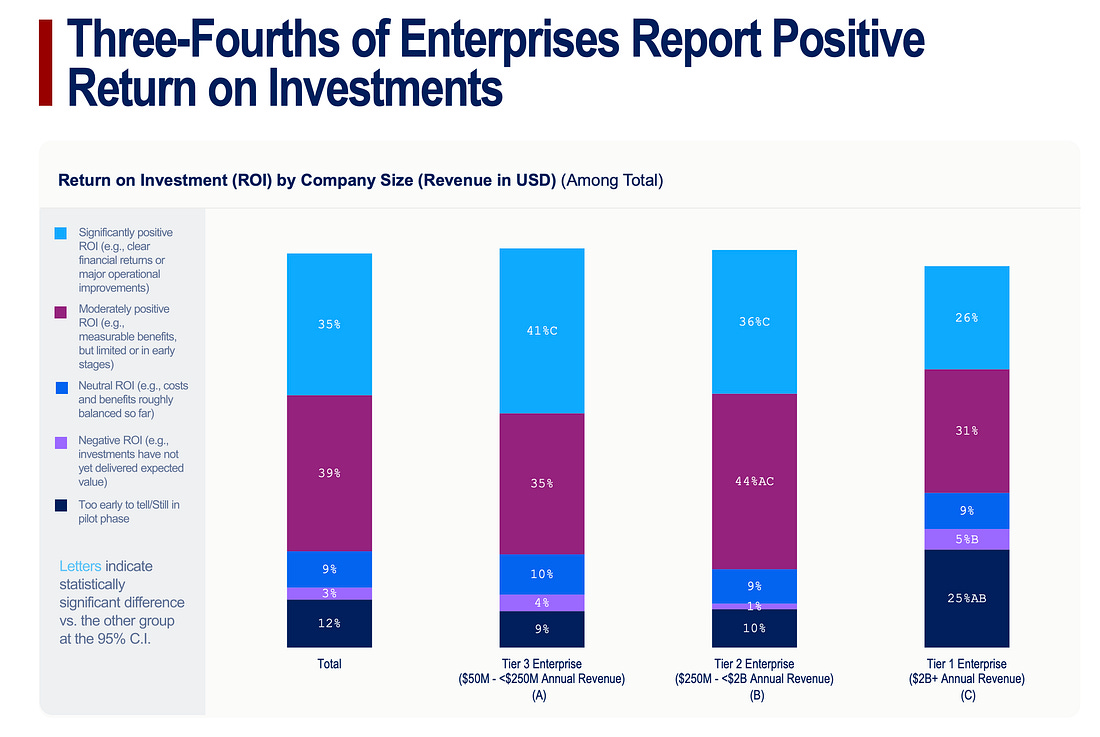 Wait, Are 74% Of Businesses Actually Seeing An ROI From Generative AI?A new Wharton study finds two thirds of businesses are actually seeing a positive ROI from generative AI. Is it a watershed moment?For months now, AI watchers have been citing an MIT study that found 95% of businesses weren’t seeing an ROI from their generative AI spend. The study’s popularity seemed to confirm what many close to the technology felt to be true: It was difficult to implement, often unreliable, and disruptive enough to upend business processes and make things a mess. These concerns may all be legitimate, but a new study from the University of Pennsylvania’s Wharton School complicates the narrative. The study found that 74% of businesses that measure the ROI from their generative AI efforts are already seeing a positive return, and more expect to see a positive ROI within the next two or three years. “These results are more positive than I was expecting,” Wharton professor Stefano Puntoni, a study author, told me in a phone call this week. “People are finding this technology is powerful. So it’s not just hype.” The Wharton study’s more positive findings stem, in part, from the broader set of use cases it considered. Where the MIT study looked at whether generative AI pilots made it into production and delivered a profit, Wharton’s incorporated a range of uses, including individual productivity, employee retention, and operational efficiency. “Our definition is very different from the MIT report,” said Puntoni. “Theirs is much more stringent.” The Wharton study doesn’t immediately refute the MIT report, but it does suggest that the tech industry’s rollout of generative AI won’t fit into a simple story. It’s yet another data point among many about a nascent technology’s viability. And even with its more positive results, it shows anything but a smooth and uniform rollout. The Wharton report, for instance, shows jagged adoption of the technology, with some industries showing much greater enthusiasm for generative AI than others. Eighty-eight percent of respondents in tech and telecom said they were seeing at least a moderately positive ROI from generative AI technology, for instance, and 83% in banking and finance said the same. In retail, only 54% of respondents said they were seeing a positive ROI so far. There were also divides by seniority. Eighty-one percent of VPs and above said they were seeing a positive ROI from the technology, while only 69% of those in manager or director jobs said the same. Middle managers, the Wharton study found, were twice as likely than VPs and above to say it’s too early to tell whether there’s a generative AI ROI or that they were still in pilot phase. “Across several questions, several indicators, we often see more positive reactions to these Gen AI programs among very senior leaders than middle managers,” said Puntoni. Smaller companies also tended to fare better with generative AI than massive companies. Only 57% of those with more than $2 billion in annual revenue said they saw a positive ROI so far. Box CEO Aaron Levie said the discrepancy was related to smaller companies’ ability to adapt faster. “The amount of output you get from AI agents will be directly correlated to how much you change (or reset) your workflow,” Levie said. “Smaller companies definitionally can change their processes more easily or start from the ground up. This is clearly harder in big companies.” The Wharton study is self reported, an important caveat, and includes responses from more than 800 people in U.S.- based companies with more than 1,000 employees and $50 million in revenue. It was done in partnership with the GBK Collective, a company that does some AI advising. Wharton paid for the study. GBK Collective partner Jeremy Korst, an author on the study, did not respond to an interview request. For the generative AI boom to persist, the technology’s end users will need to find a clear return on their spending. Without that, all the infrastructure investment in the world won’t matter. And even then, the generative AI financial experiment’s payoff is far from guaranteed. “The numbers are so large,” Puntoni said. “I’m not in a position to say whether that makes any sense.” The new era of capacity: Introducing Globant’s AI pods (sponsor)AI is changing how every business operates, but scaling it safely and effectively still challenges most enterprises. In a recent Big Technology interview, Globant Co-founder and CEO Martín Migoya explained how the company is redefining AI delivery with a capacity-based approach. That vision comes to life in Globant’s AI Pods, a subscription-based model that combines agentic AI with human oversight to deliver measurable business outcomes. Each Pod operates like a dedicated AI-augmented team: secure, composable, and continuously improving as new models emerge. Built on Globant Enterprise AI, AI Pods give organizations predictable pricing, full IP ownership, and adaptive capacity that grows with demand. From automating workflows to orchestrating complex systems, it’s a new foundation for enterprise-scale AI, built for speed, safety, and sustained innovation. Learn more about AI Pods: https://www.globant.com/ai-pods Advertise with Big Technology? Reach 150,000+ plugged-in tech readers with your company’s latest campaign, product, or thought leadership. To learn more, write alex@bigtechnology.com or reply to this email. What Else I’m Reading, Etc. Amazon’s massive Rainier AI data center is up and running in Indiana [CNBC] Tennessee man spends month in jail over a Trump meme the sheriff didn’t like [WTVF] The Times Of London called the wrong Bill Deblasio [Semafor] Harvard students distraught over grade inflation claims [Harvard Crimson] Profile of tech PR rep and AI critic Ed Zitron [Wired] The secret behind bowhead whale longevity [New York Times] Make LinkedIn your most powerful 
