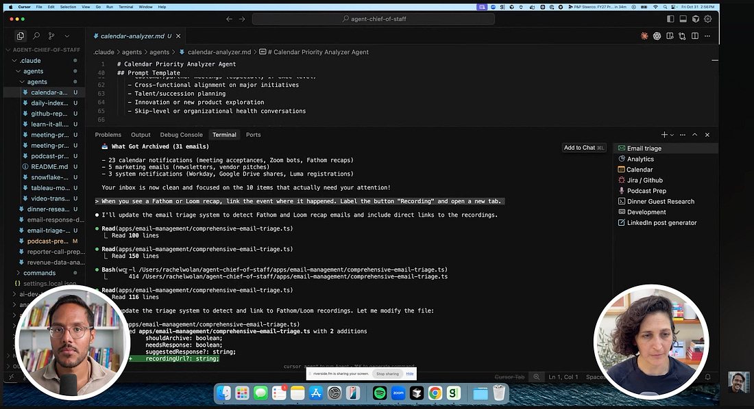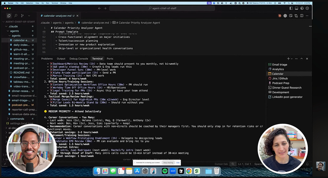Show your team it’s OK to experiment. Sometimes it works, sometimes it doesn’t. That’s part of building today. 1b. The Calendar Agent That Runs Her WeekRachel built her “agentic chief of staff.” A combination of Claude Code agents and an app she uses daily. The calendar agent was generated by Claude. She runs it weekly with one simple prompt: “Analyze my calendar for the last two weeks. How did I spend my time? Where could I have been more effective at delegating?” What the agent returns: