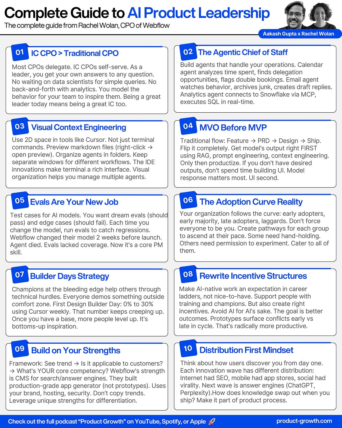 Step 2: Run Builder DaysChampions on the team who are at the bleeding edge help walk people through getting over technical hurdles. The rule: Everyone has to demo something. It can be in any tool, but you have to go outside your comfort zone. Results from the first Builder Day in design: They went from nobody using Cursor to 30% of the team using Cursor weekly. That number keeps creeping up. Next: A second Builder Day for product, design, and insights. This is about having champions who are bottoms-up showing things off, while also saying here are the behavior changes we expect. 2c. Rewrite Your Career LadderWebflow is rewriting their career ladder to incorporate this as an expectation. You want people supported, but you also want to create the right incentives. And you want to make sure you’re thinking through: Are you just inserting AI for AI’s sake? At the end of the day, you want a better outcome. Rachel’s example: A designer put together a prototype for their answer engine optimization workflow (AEO is the new SEO). A director of design said, “I was in a design review where somebody else had a prototype that looked a lot like what you’re building. I want you two to go harmonize your prototypes.” It’s easier to do now than being so far down the product development lifecycle when you realize two workflows don’t work together. Prototypes surface conflicts early. 3. Shipping AI-Native Features: The Webflow PlaybookBeing productive with AI is one thing. Shipping AI-native products to millions of users is another. 3a. MVO Before MVPMost teams build like this: Feature idea, write PRD, design, give to engineering, ship, promote. Rachel flips it. Her framework: MVO (Minimal Viable Output) before MVP. (Similar to Kuse CEO Xiankun Wu). Before you productize anything, get the model’s output right first. Use all the techniques (RAG, prompt engineering, context engineering) to get stable, correct responses. Only then do you build the feature. Rachel’s rule: “If you don’t have desired outputs, you don’t really need to spend any time to productize the AI feature.” Wrong order: UI first, then realize the model doesn’t work. 3b. Evals Are Now Part of Your JobRachel shared a brutal story. Webflow’s AI app generator (a code-gen product that creates production-grade apps using your design system and CMS) was two weeks from launch. Rachel was patient zero, testing it for this podcast. The agent kept dying. They finally realized: They’d changed the underlying model. And their evals didn’t have enough coverage to catch it. 3c. Build on Your StrengthsRachel’s framework for deciding which AI features to build: Question 1: If you see a trend in market, is it applicable to your customers? Question 2: What’s your core competency? For Webflow, their strength is helping customers bring visitors to their front door. Their CMS gets rendered for search engines and answer engines (ChatGPT, Perplexity, etc.). They saw that people don’t want an app generated off to the side by Lovable or Vero. That’s more like a prototype. People want production apps. Webflow focused on native integration with everything else. Production grade hosting. Security capabilities built into Webflow cloud. I loved how Rachel is pushing forward AI at Webflow. Check out the transcript for more: Where to Find Rachel WolanRelated ContentNewsletters: PS. Please subscribe on YouTube and follow on Apple & Spotify. It helps! Invite your friends and earn rewardsIf you enjoy Product Growth, share it with your friends and earn rewards when they subscribe. |