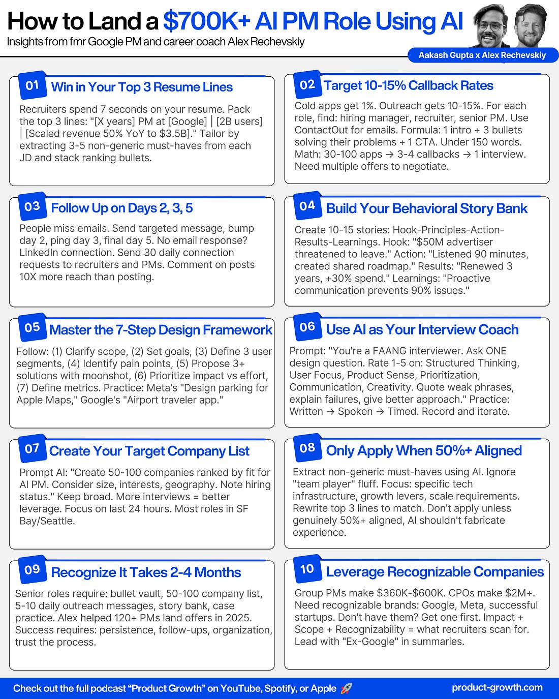How to Land a $700K+ AI PM Job Using AI by Google PM Alex RechevskiyStep by step breakdown for PMs to land six-figure AI PM roles.Check out the conversation on Apple, Spotify and YouTube. Brought to you by: Linear: Plan and build products like the best. Today’s EpisodeSome PM jobs pay $700K+. Others pay $140K. But the PMs aren’t much different. It’s more about what companies they work at and how they job search. Today’s episode with Alex Recheveskiy is a breakdown into their methods. As a PM at Google, Alex was making $900K+, and he drops all his secrets coaching 100s of others: Your Newsletter Subscriber BonusFor subscribers, each episode I also write up a newsletter version of the podcast. Thank you for having me in your inbox. Today, we cover: