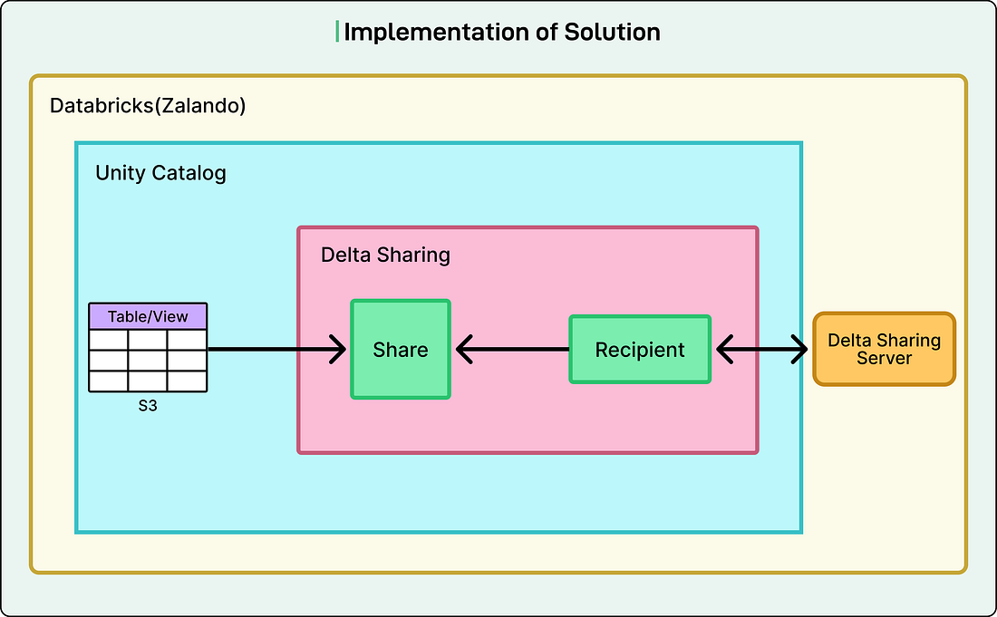 By using the managed service, the Zalando Engineering Team could focus on delivering value to partners rather than spending time maintaining infrastructure. Simplified Architecture and ImplementationOnce the Zalando Engineering Team validated Delta Sharing as the right solution, the next challenge was designing a clean and efficient architecture that could be scaled across thousands of partners. Their approach was to keep the system simple, modular, and easy to manage while ensuring that security and governance remained central to every layer. At its core, the new data-sharing framework relied on three main building blocks that defined how data would be organized, accessed, and distributed: