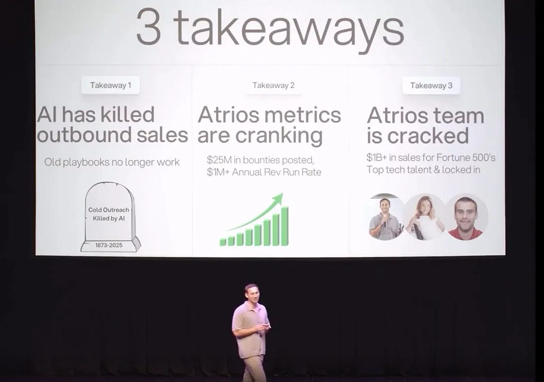 Atrios validated its wedge, refined its product, and onboarded real enterprise users while still in the program. The learning curve compressed dramatically. What Atrios is building behind the scenesSpeedrun gave Atrios momentum. The product itself gives it leverage. Atrios is built around three layers: 1. The Wedge: warm introductions at scaleCompanies pay for meetings. Connectors make money from their network. Atrios automates the trusted pathways between them. 2. The MarketplaceA decentralized salesforce emerges organically. Anyone with useful relationships can earn from introductions. 3. The Data LayerEvery intro adds to Atrios’s relationship graph. Over time, it becomes one of the most valuable datasets in B2B: a living map of trust. This is what replaces cold outbound. Demo Day: Atrios steps into the spotlightTaylor closed Demo Day with a bold presentation that became one of the most talked-about pitches of the morning. He teased the audience with a twenty-second intro, pretended to walk off stage, then delivered a two-minute sprint that reframed Atrios as the world’s largest decentralized salesforce. The punchline was simple. Atrios had already hit a one-million-dollar run rate in four months. Why Atrios Matters for the Future of AI and B2B SalesAtrios shows how AI is reshaping go-to-market. Sales has always relied on relationships, and AI now gives teams a way to understand those relationships at scale. Instead of pushing cold outreach, companies can move through the trusted paths that already exist. AI shifts sales toward trustAtrios helps teams see who can open a door and why an introduction works. Relationship intelligence becomes the new GTM layerThe next generation of tools will not only track contacts but also understand influence and connection strength. Atrios is building directly into that shift. What founders can take from thisStrong people accelerate you. Warm networks outperform volume. High standards and fast iteration make each other stronger. Taylor captured the experience in one line: