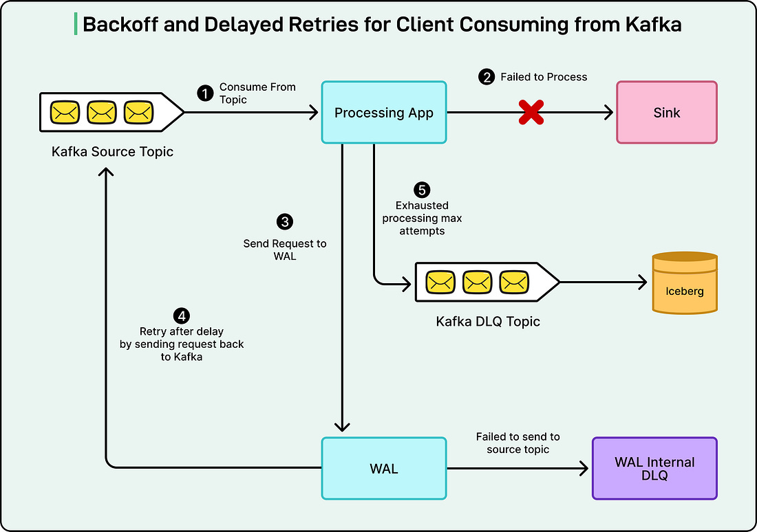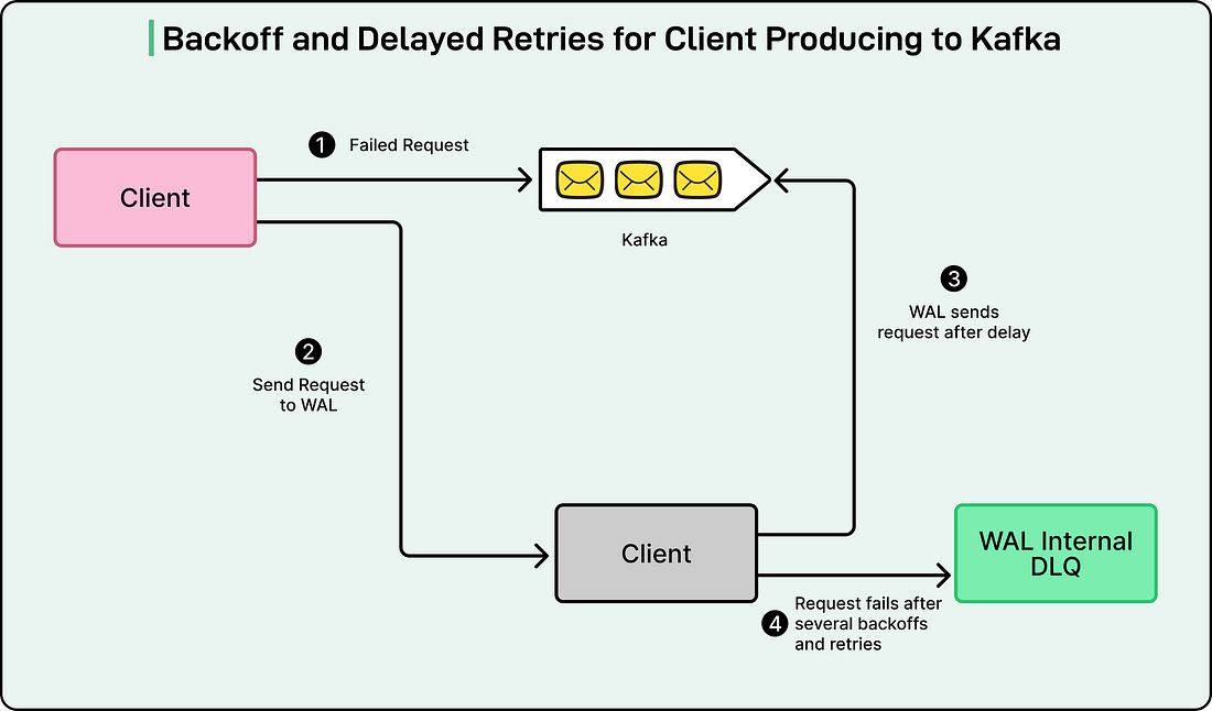 Each namespace in WAL has its own configuration that defines how it behaves. For example, one namespace may be set up to use Kafka for high-speed streaming, while another might rely on Amazon SQS for delayed message delivery. The team can adjust settings like retry counts, backoff times, and delay intervals depending on what each application needs. Different Use Cases of the WALNetflix designed the WAL system to be flexible enough to support many different situations, which they refer to as personas. Each persona represents a unique way that WAL is used within the company’s data ecosystem. Let’s look at a few of the main ones to understand how this system adapts to different needs. 1 - Delayed QueuesThis use case comes from the Product Data Systems (PDS) team, which handles a lot of real-time data updates. In large-scale systems like Netflix, failures are inevitable. Sometimes, a downstream service such as Kafka or a database might be temporarily unavailable due to network issues or maintenance. Instead of losing messages or forcing engineers to manually retry failed operations, WAL automatically steps in. When a system failure occurs, WAL uses Amazon SQS (Simple Queue Service) to delay messages and retry them later. See the diagram below for backoff and delayed retries for clients producing to Kafka: Here’s how it works in simple terms: