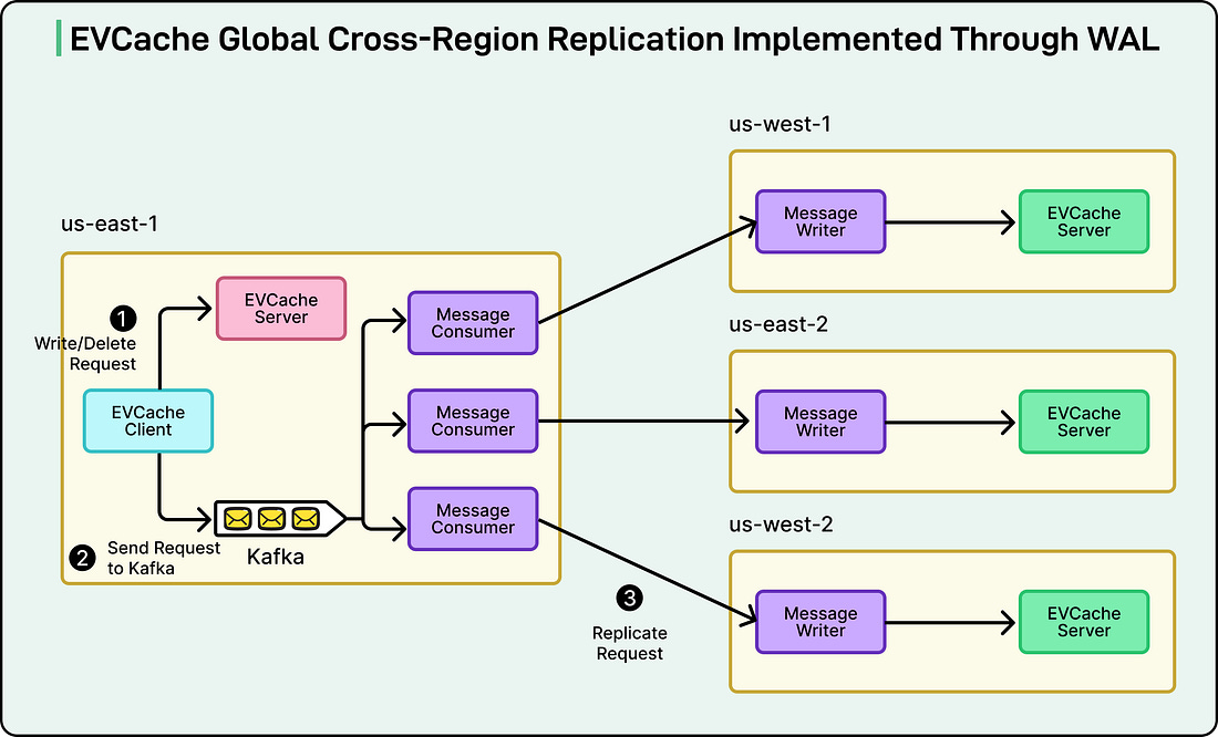 The diagram below shows the backoff and delayed retries for clients consuming from Kafka: This approach saves engineers a lot of time and prevents cascading failures that might otherwise spread across the platform. 2 - Cross-Region ReplicationAnother major use case is data replication across Netflix’s global regions. The company’s caching system, EVCache, stores frequently accessed data to make streaming fast and reliable. However, since Netflix operates worldwide, the same data needs to exist in multiple regions. WAL makes this replication seamless by using Kafka under the hood. Whenever data is written or deleted in one region, WAL captures that event and sends it to other regions. The consumers in each region then replay the same operations locally, ensuring that all copies of the data stay synchronized. See the diagram below: In simpler terms, WAL acts like a reliable postman, making sure every region receives the same “letters” (data updates), even if network disruptions occur. This system keeps Netflix consistent around the world. Users in India, Europe, or the US all see the same data at nearly the same time. 3 - Multi-Partition MutationsThe final example involves Netflix’s Key-Value data service, which stores information in systems like Apache Cassandra. Sometimes, a single operation might need to update data spread across multiple partitions or tables. Handling these multi-part changes is tricky, especially in distributed systems, because a failure in one partition can leave others out of sync. WAL solves this problem by ensuring atomicity, meaning that either all the changes succeed or all are retried until they do. To achieve this, Netflix’s WAL combines Kafka for message delivery with durable storage for reliability. This setup functions similarly to a two-phase commit, a well-known database technique that guarantees data consistency across multiple locations. In short, WAL coordinates complex updates so that Netflix’s data remains correct, even when multiple systems are involved. Internal ArchitectureTo understand how Netflix’s Write-Ahead Log (WAL) works behind the scenes, it helps to break it down into its main building blocks. See the diagram below: The system is made up of several key components that work together to move data safely from one place to another while keeping everything flexible and resilient.