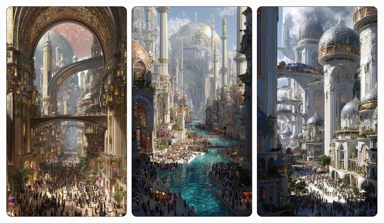 | Midjourney Prompt: A hyper-detailed utopian version of Istanbul [or another city of your choice]; enormous futuristic structures inspired by Ottoman-Byzantine architecture, gigantic column-based megastructures rising over the city, domes and minarets redesigned in advanced crystal-metal composites. Ultra-complex patterns carved into every surface: illuminated arabesque motifs, gold-infused filigree lines, geometric mosaics, holographic calligraphy flowing across the buildings. Massive bridges and skywalks connecting colossal towers, reminiscent of the Bosphorus but transformed into an elevated, multi-layer energy river. The ground level is a bustling urban plaza filled with hundreds of people, diverse clothing styles blending futuristic fabrics with traditional silhouettes; vibrant crowds, dynamic movement, street vendors, floating lanterns. Atmosphere filled with soft morning haze over the futuristic skyline; sunlight breaking through gigantic columns, domes glowing with internal energy. Wide-angle cinematic shot, extreme detail, 8K realism, deep perspective, intricate textures everywhere. Negative: no blur, no distorted faces, no extra limbs, no low-quality details, no broken architecture, no warped perspective, no watermark. --ar 9:16 --style raw
