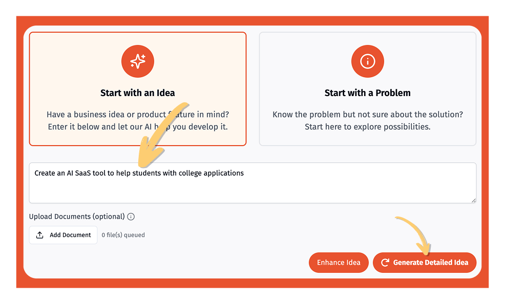 | Sample Prompt: "Expand my Korean skin care brand to the US" OR | "Create an AI SAAS tool to help students with college applications" | Upload documents (if any) and hit generate (your detailed idea is created) Use the navigation to choose and create deliverables such as market research, vision, personas, financial model, business requirements, and 15+ others. Get advice from the Cofounder Chatbot (at bottom) Export your summary or pitch deck - or any deliverable you want in a doc file